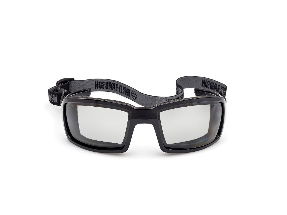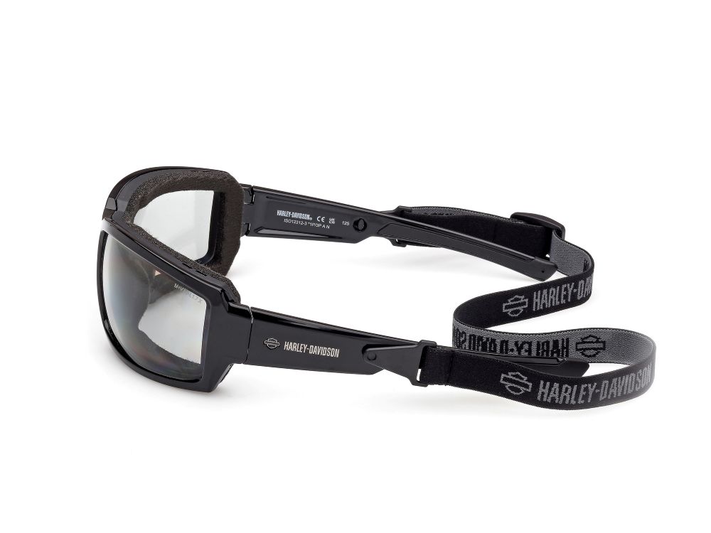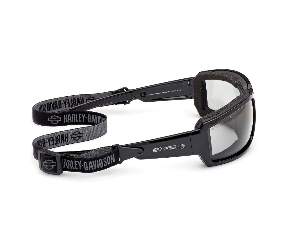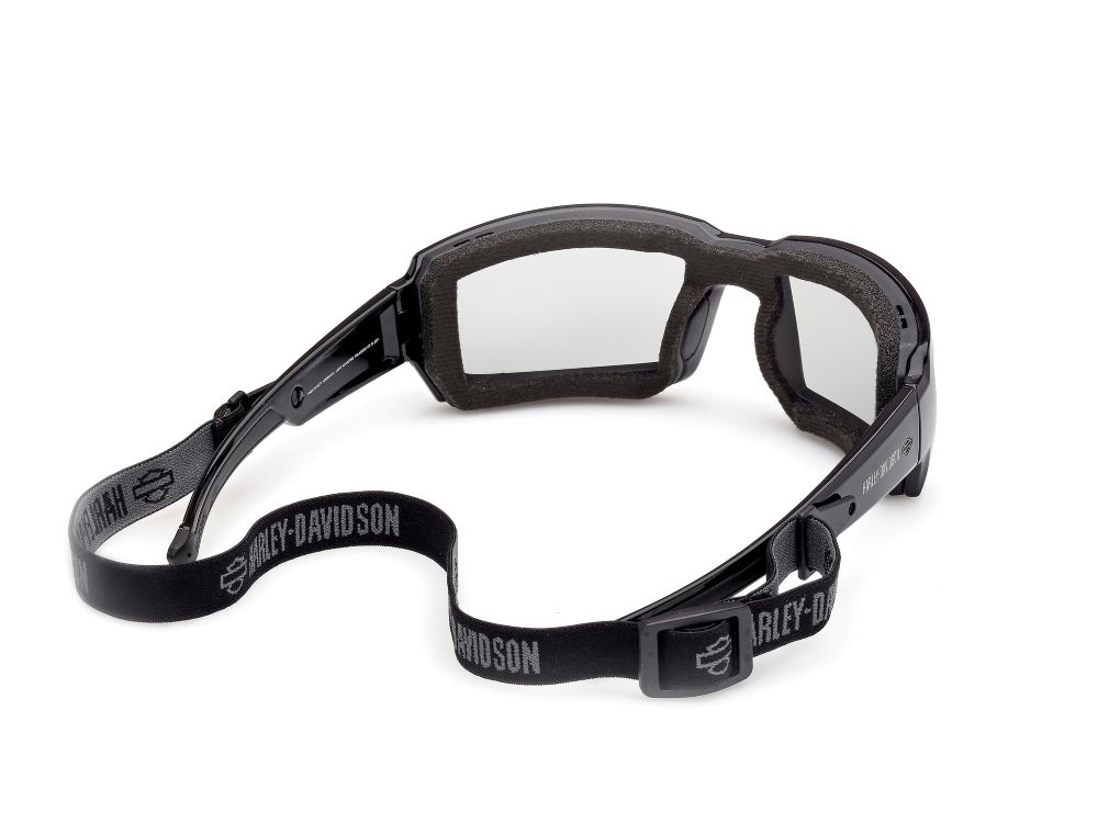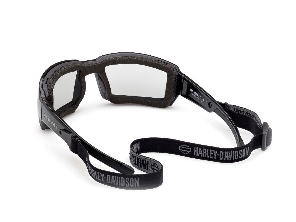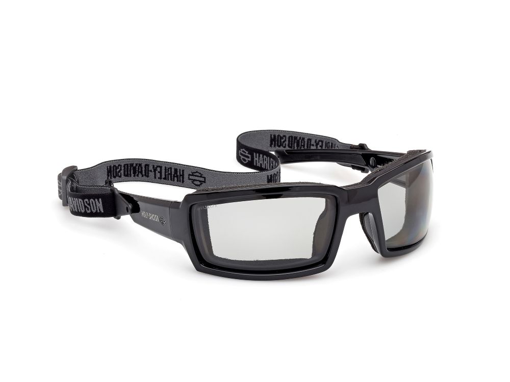 Harley-Davidson® Tour of Duty-Sonnenbrille mit photochromen und polarisierten Gläsern. Photochrome Linsen sind Linsen, die bei Einwirkung von UV-Strahlung oder Sonnenlicht im Allgemeinen eine reversible chemische Reaktion auslösen und sich verdunkeln. Sobald das Licht bzw. die UV-Strahlung verschwindet, kehren sie allmählich in ihren ursprünglichen transparenten Zustand zurück. Farbverändernde Kontrastlinsentechnologie, die starke gelbe Lichtwellen reduziert, um die Farbwahrnehmung, Sehschärfe und Tiefenwahrnehmung zu verbessern.