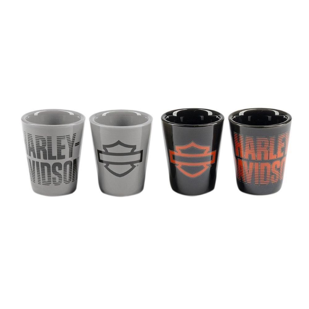 60 ml Keramik-Schnapsgläsern mit jeweils einer einzigartigen H-D-Fade-Grafik. Spülmaschinenfest.