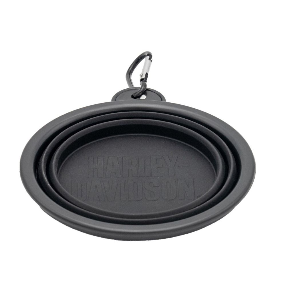 Zusammenklappbare Silikonschale in Lebensmittelqualität mit geprägtem Harley-Davidson-Logo. Enthält Metall-Karabiner-Clip für einfachen Transport.