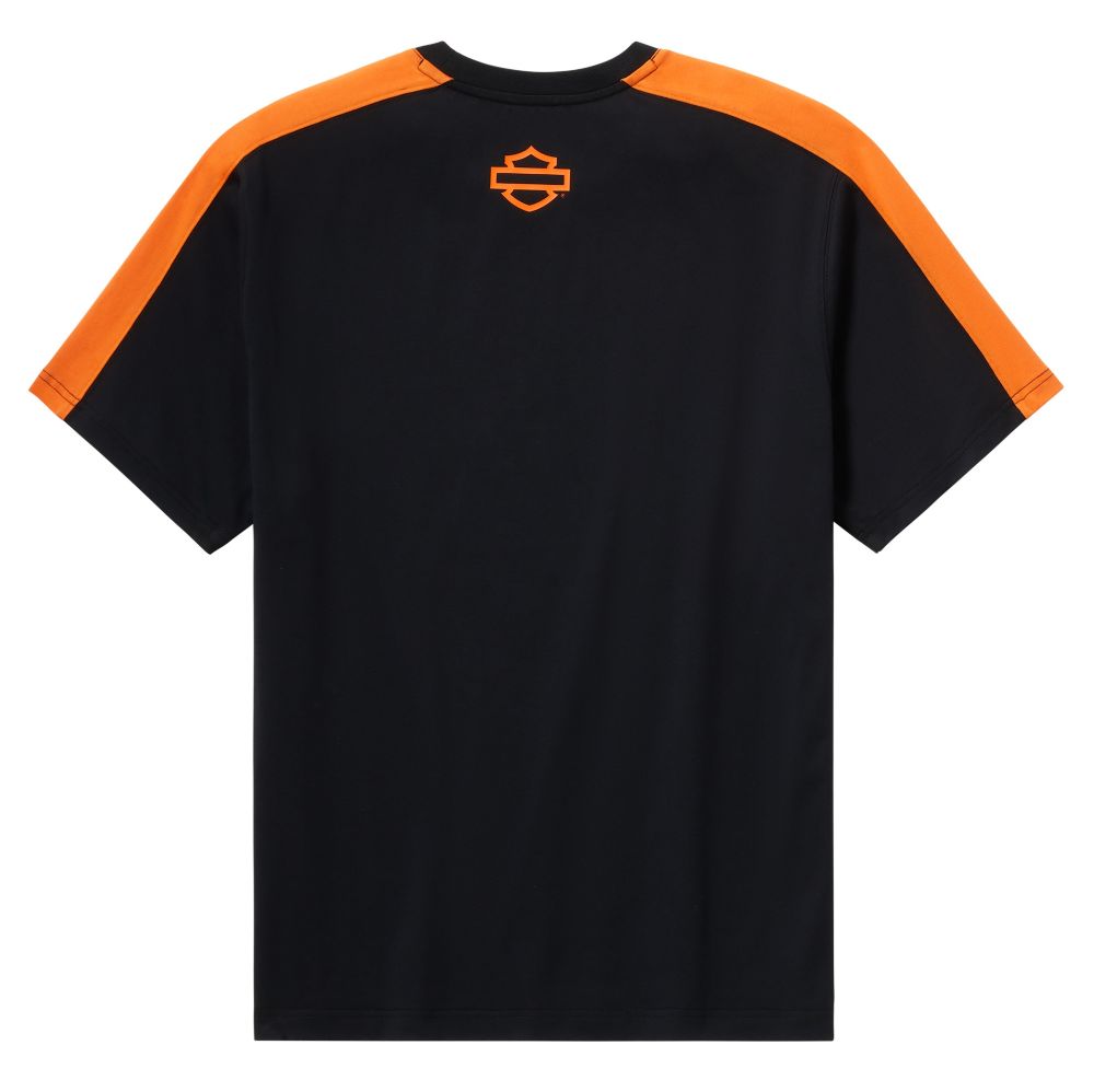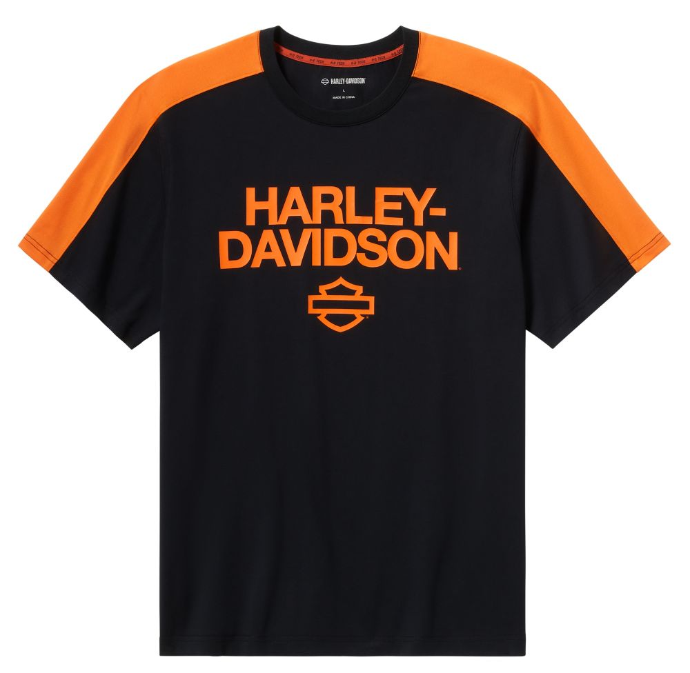 Das H-D® TECH Coolmax® T-Shirt bietet einen lebendigen, coolen Stil. Denn dieses Herren-T-Shirt ist aus einer Coolmax®-Jersey-Mischung geschnitten, die Feuchtigkeit ableitet und Ihnen hilft, Ihre Schweißprobleme zu bewältigen. Die lockere Passform mit Rippenstrick am Halsausschnitt sorgt dafür, dass es seine Form behält. Kühnes Design mit kontrastierenden Ärmelabschlüssen und unserer modernen Grafik.